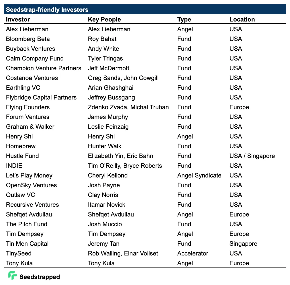 Here's my first stab at seedstrap-friendly investors directory, which will hopefully be growing over time: