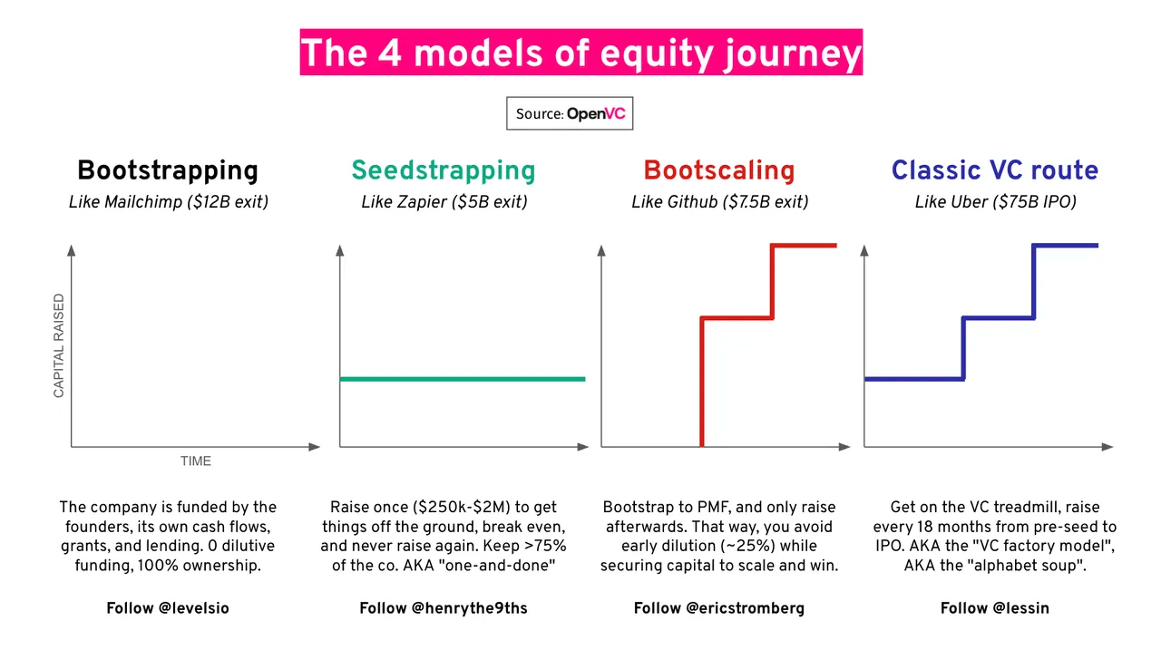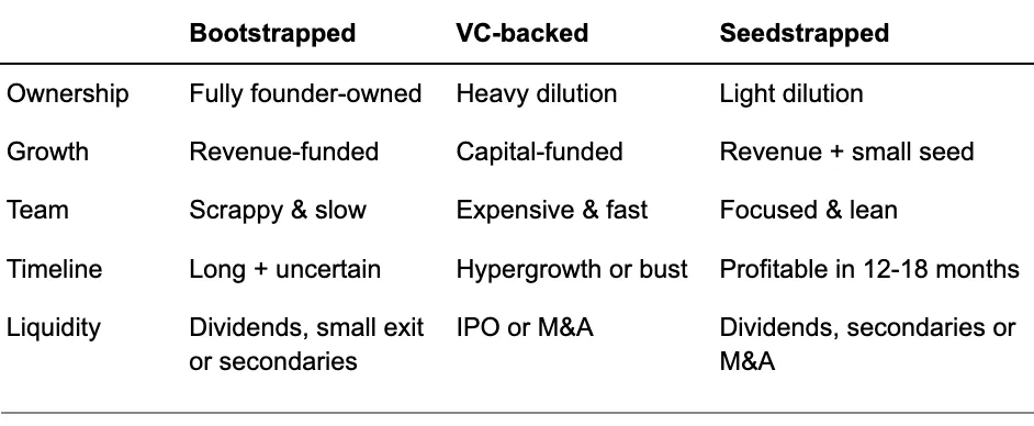 Having bootstrapped my first company (and shut it down after one year), co-founded two VC-backed SaaS businesses, and now invested in two startups that build with the seedstrapping mentality - I’ve seen firsthand how different the mindset, incentives and trajectory can be for each one.