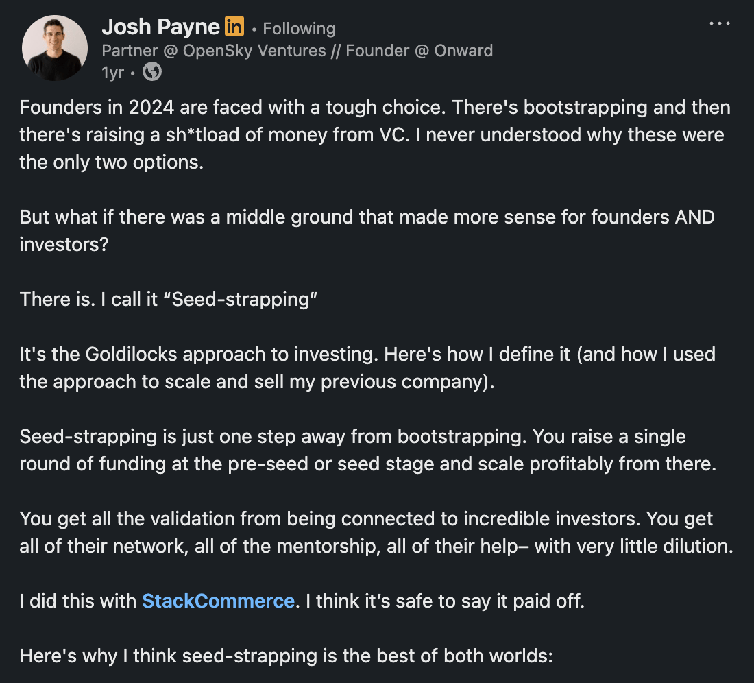 But there’s a growing movement of founders (and investors) proving there’s a smarter middle path - raise a small, intentional round once, then grow to profitability instead of raising again - a model whose name is quickly gaining popularity: seedstrapping.