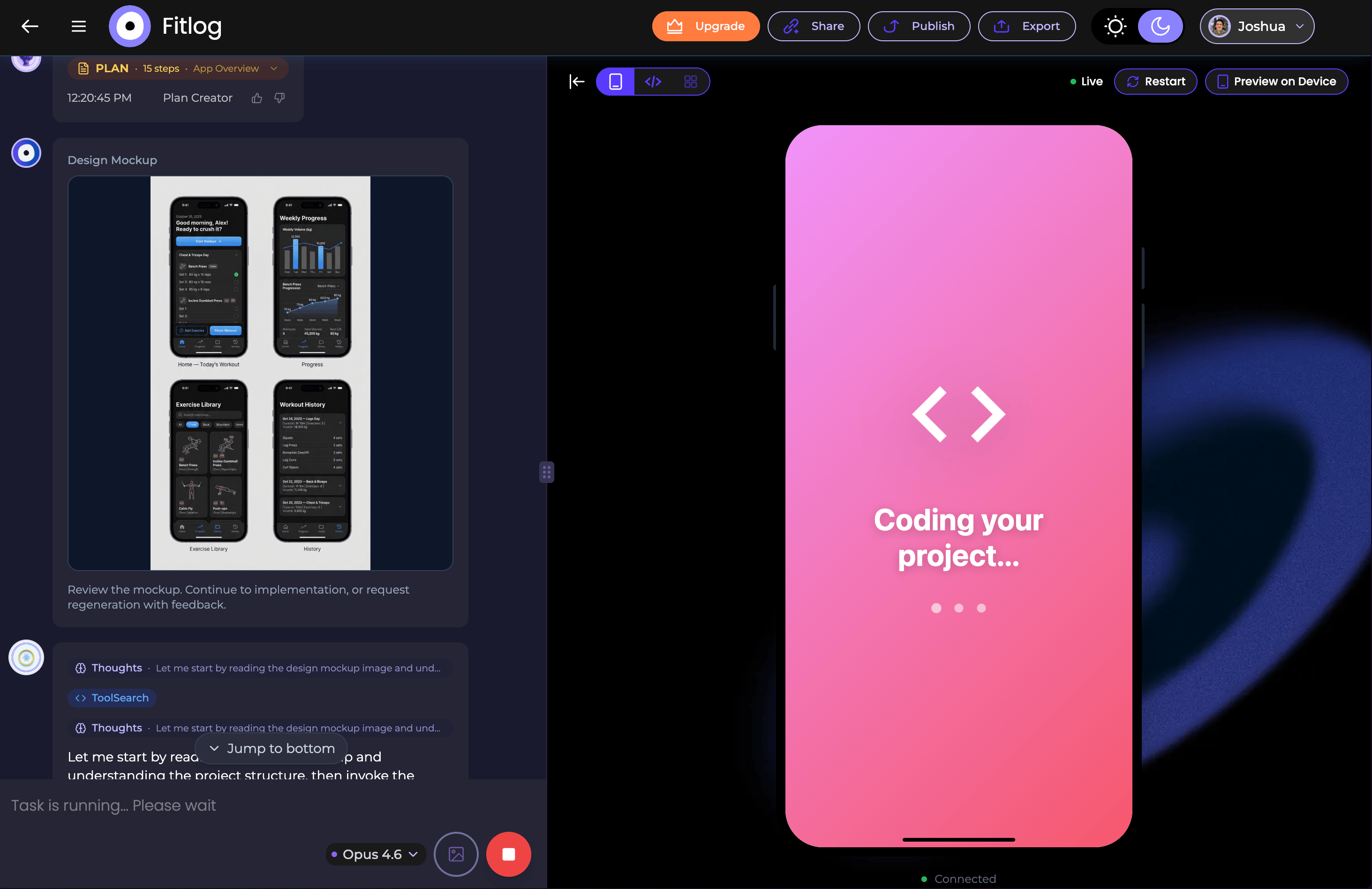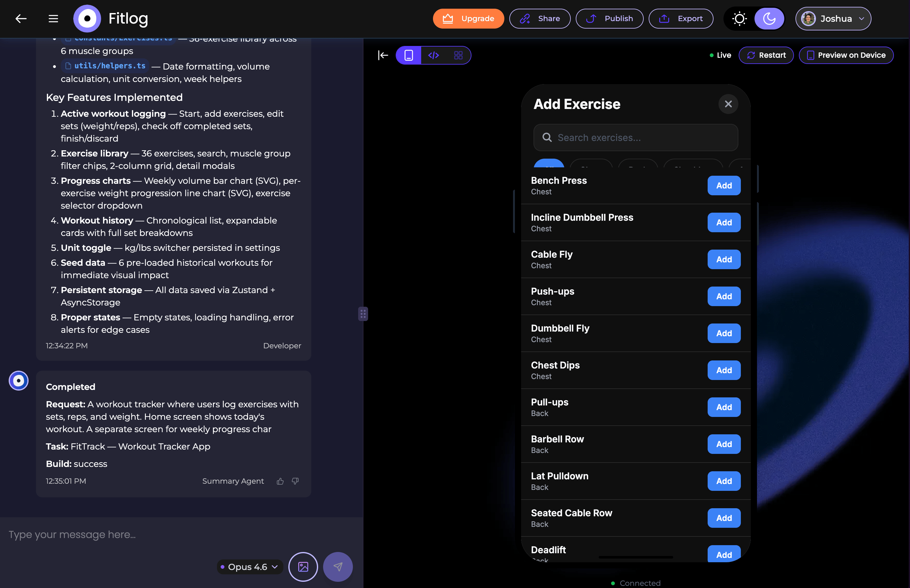 Fastshot brings vibe coding to mobile. You describe your app in a chat interface, AI generates production-ready React Native code, and you iterate by telling it what to change. The output is real, typed TypeScript running on Expo, not a wrapped web view or a drag-and-drop prototype. And you can ship it to both app stores without opening a code editor.