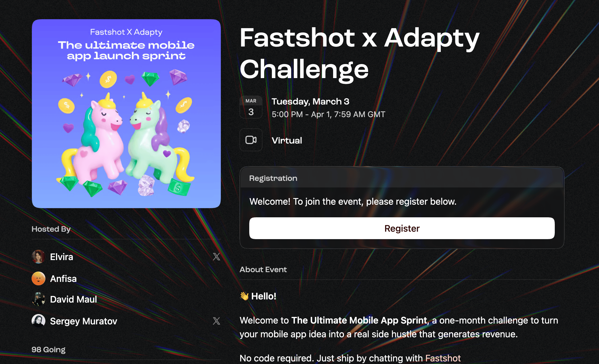 The Fastshot x Adapty Challenge is a 30-day hackathon where builders are creating monetised mobile apps from scratch. If you want to try vibe coding a mobile app with a deadline and some community around it, this is a good way to start.